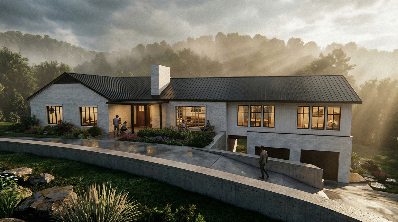 This project introduces a second-level addition positioned above the existing detached garage and extending across the breezeway to connect back into the main house. Rather than expanding outward into the site, the design builds within the footprint of the existing structures and strengthens the relationship between parts of the home that were previously experienced as separate.