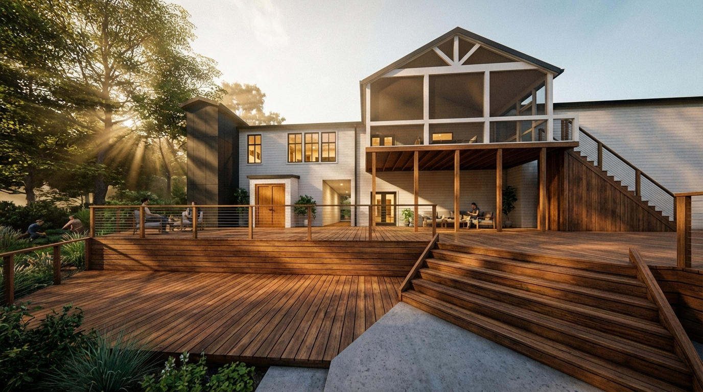 The addition uses complementary exterior materials and coordinated roof forms that relate to the existing house without directly replicating it, allowing the new work to feel both integrated and clearly legible as part of the home’s continued evolution.