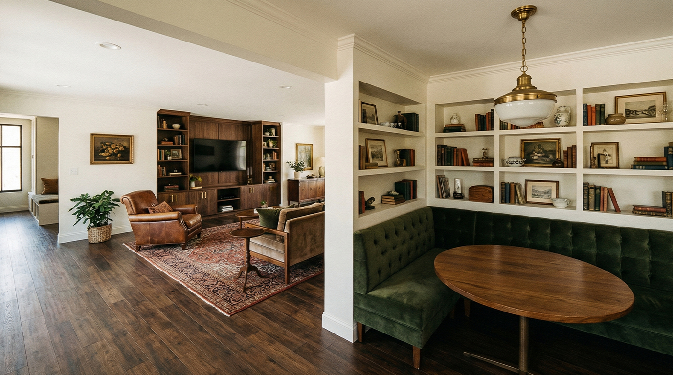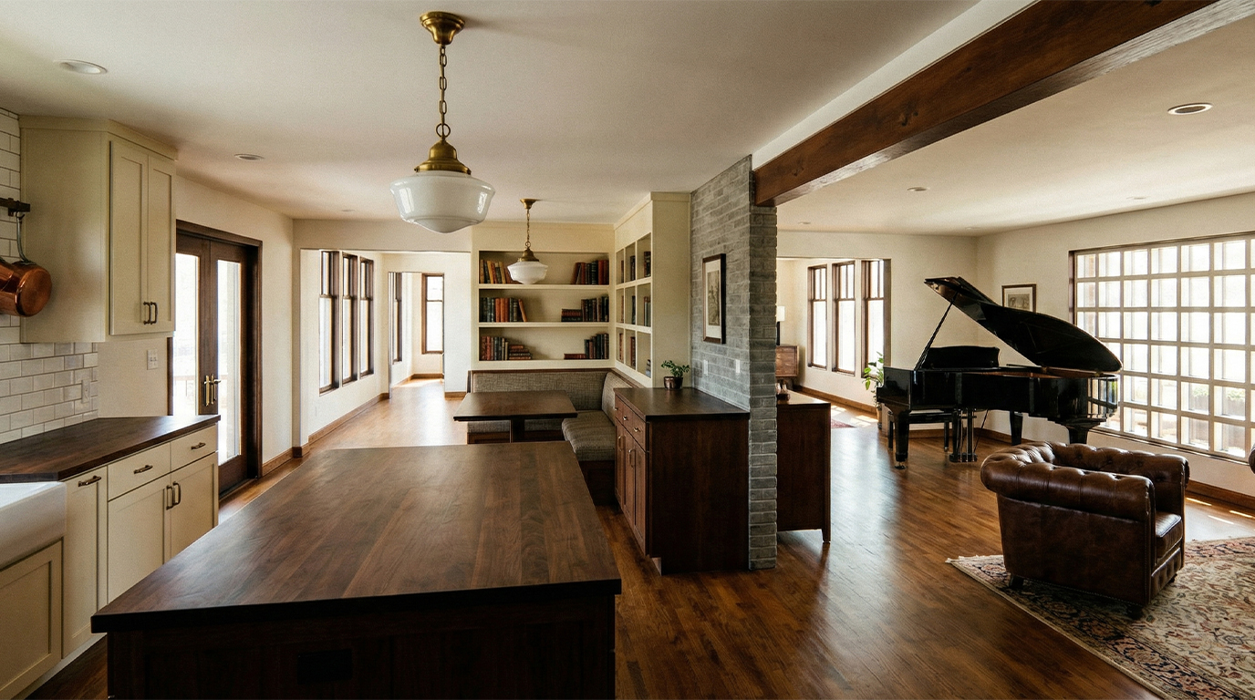 At the center of the addition is a new living room conceived as an elevated gathering space that expands the shared areas of the home. Secondary spaces—including a flexible office or bedroom, a bathroom, and a small mudroom connection—support this primary space and help organize the transition between the garage and the main house.